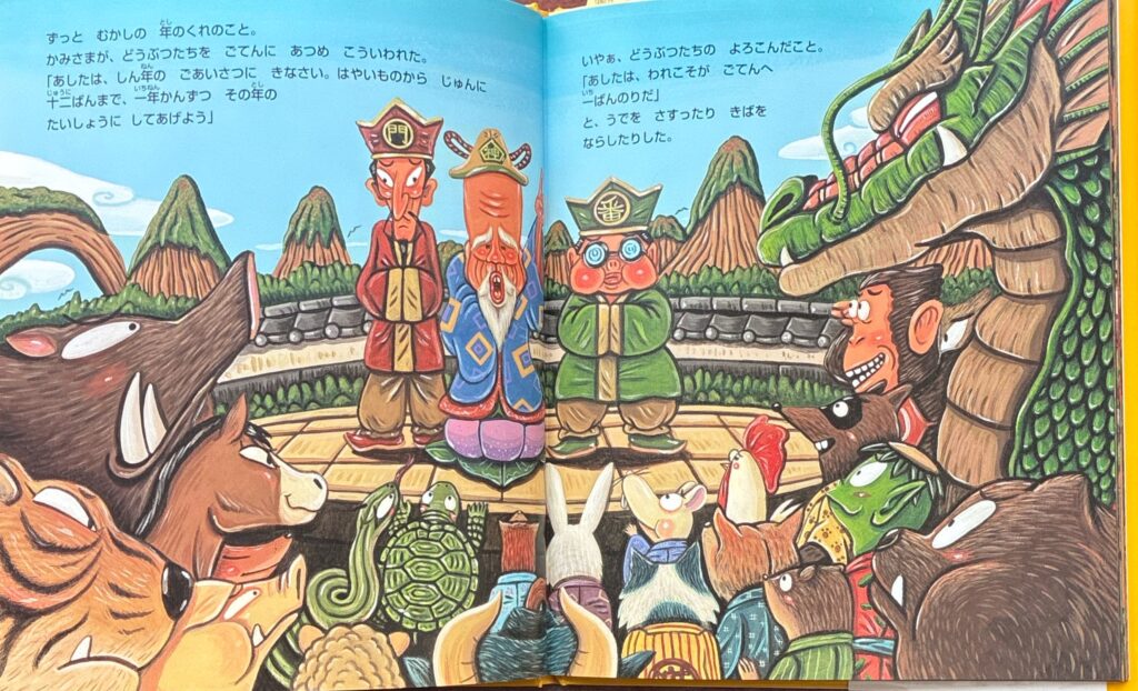 「なあーに、一ばんにならなくても十二ばんまでに、はいればいいんだ」うしはあわてて、かけだすでもなく、ねずみにどなるでもなく、のったら ゆったら、もんをくぐっていった。それで 二ばんめになったそうです。