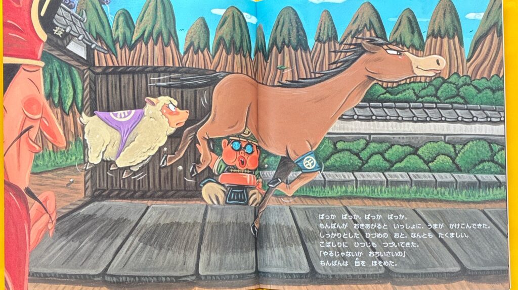 ねずみは、かしこく、うしのあたまにのり、みんながうごきだすまえに、うしとよみちをあるきだした。うまははやく、ひつじやとりもきゅうでんをめざした。さいごにいのししも「もうとっしん」しました。