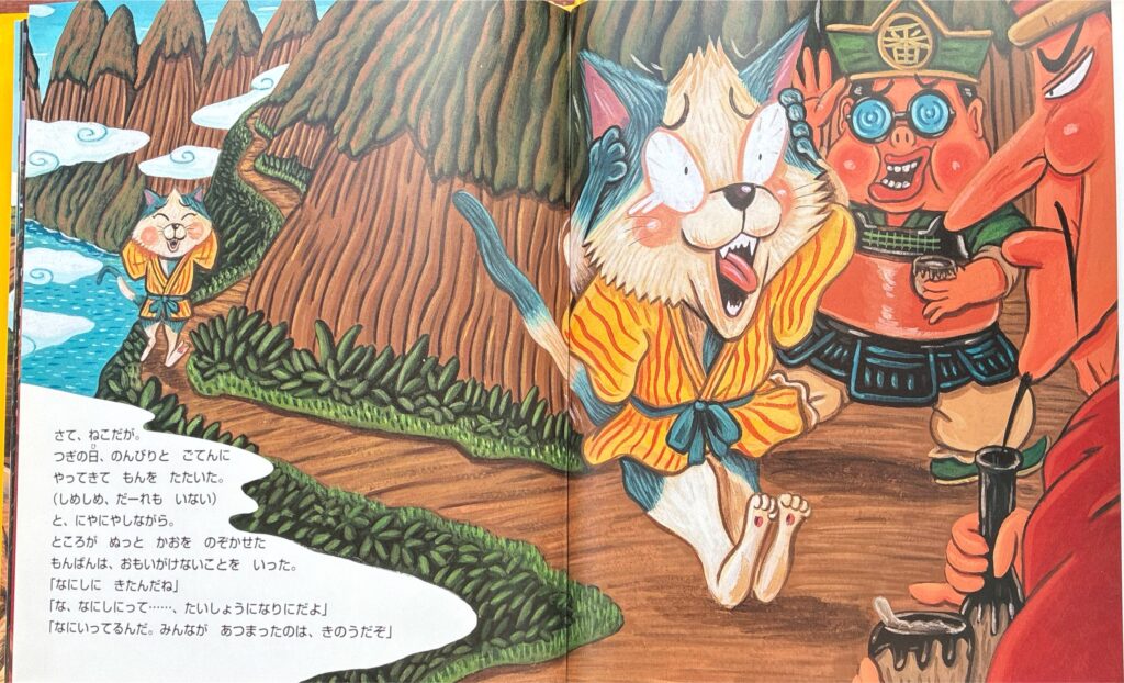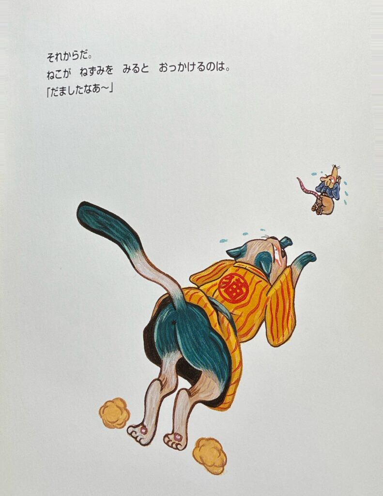 ねこは、ねずみにだまされて、はしゃぎ、とびはねたりし、歌っていたりと油断し、みんなが門の中にはいったあとの正月二日についてしまい、ねずみにだまされたことに気ずいたのです。ねずみが一ばんにで王冠をかぶりました。