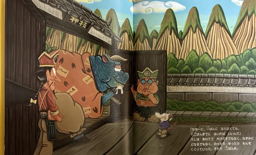 門に入るときねずみは牛のあたまからとびおり一番になったそうです。