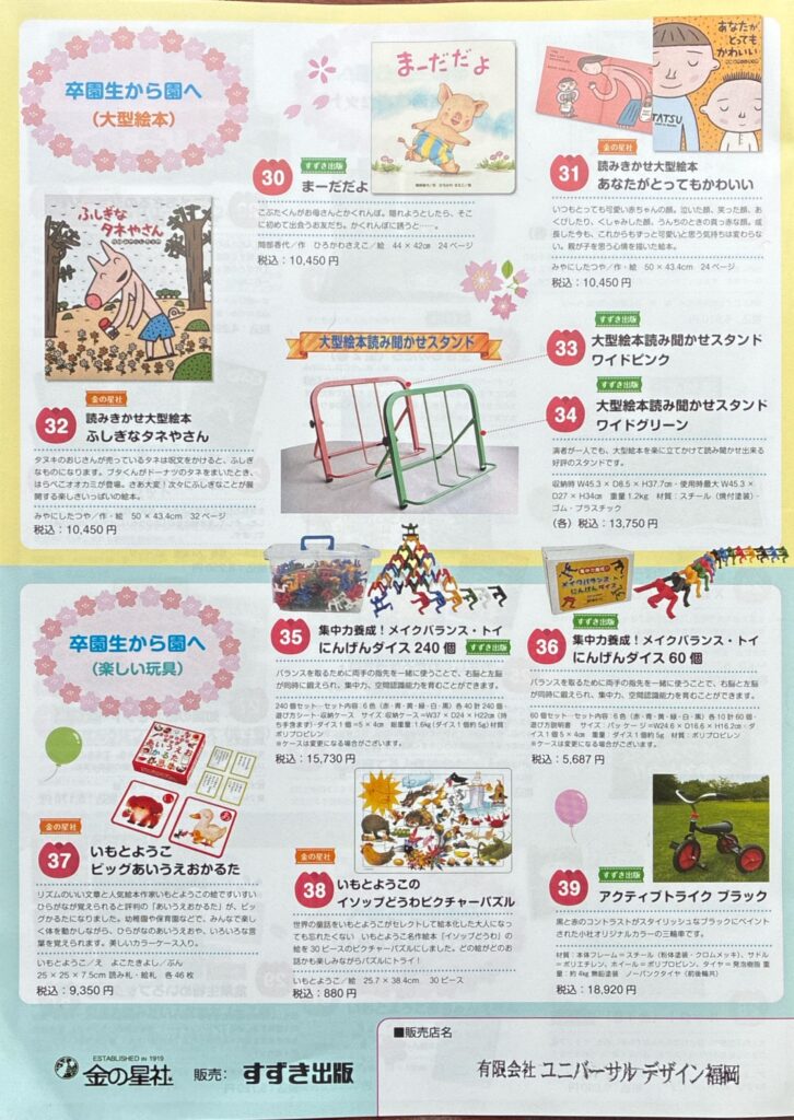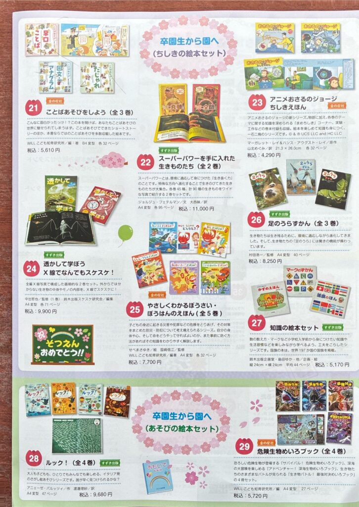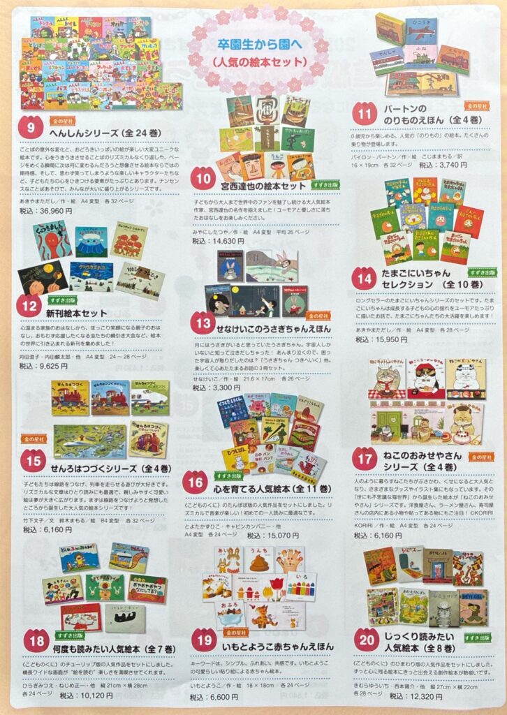 2026年1月20日 / 最終更新日時 : 2026年1月20日 udf1833 コラム 卒園・進級おめでとうフェアー こどもたちの記念になるおすすめの商品をラインナップしました。 卒園生にお祝いや、卒園生が園へ贈る記念品として最適な絵本など選んでください! 卒園生から園へ(人気の絵本セット) 卒園生から園へ大型絵本・楽しい玩具など勧めいたします。 コメントを残す コメントをキャンセルメールアドレスが公開されることはありません。 ※ が付いている欄は必須項目ですコメント ※ 名前 ※ メール ※ サイト 次回のコメントで使用するためブラウザーに自分の名前、メールアドレス、サイトを保存する。