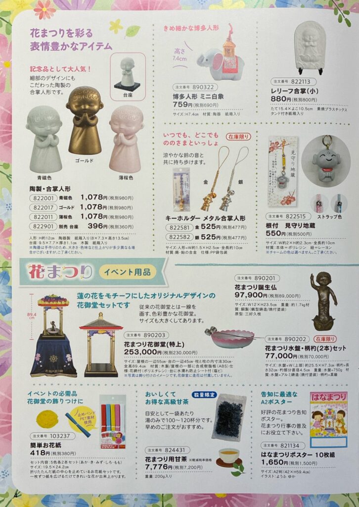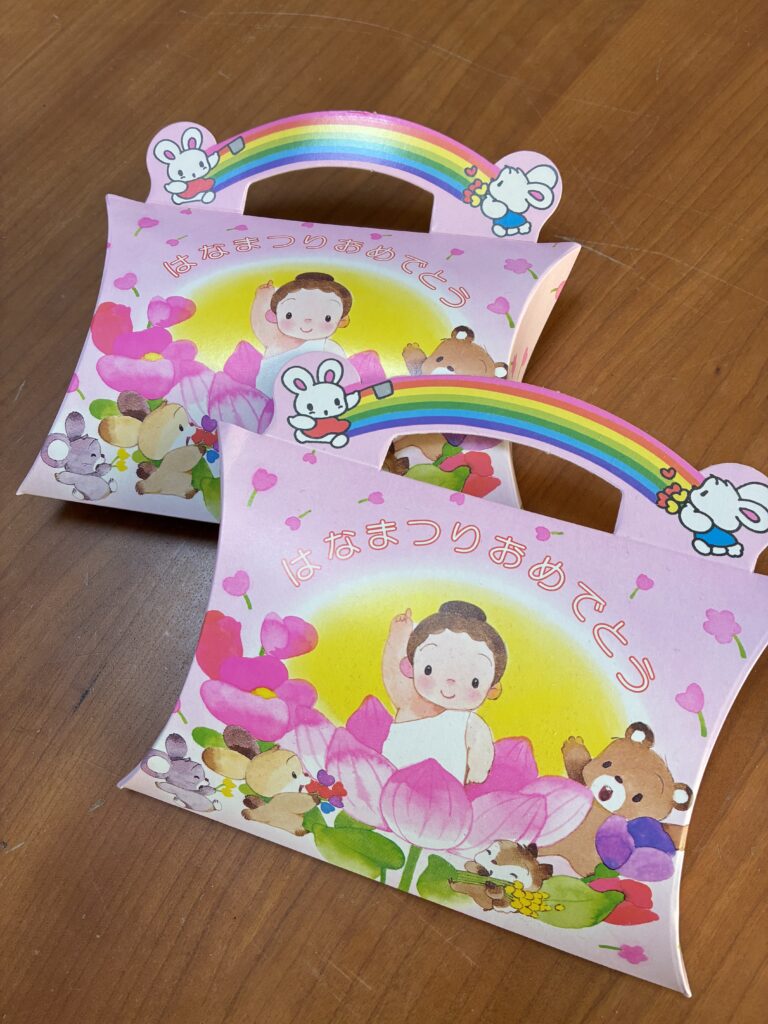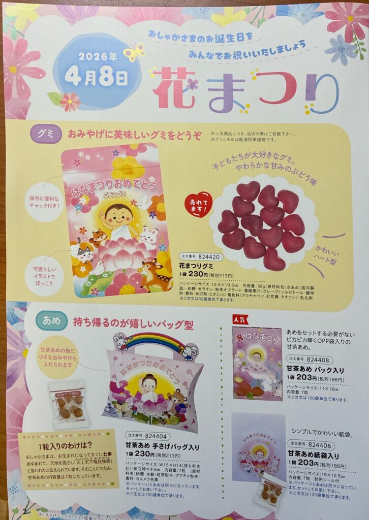 2026年1月23日 / 最終更新日時 : 2026年1月23日 udf1833 お知らせ 4月8日 花まつり おしゃかさまのお誕生日をみんなでお祝いいたしましょう 持ち帰るのが嬉しいバッグ型 7粒入りのわけ? おしゃかさまはお生まれになってすぐに七歩あゆまれたので、そのことをちなみ甘茶あめの内容量は7粒になっています。 コメントを残す コメントをキャンセルメールアドレスが公開されることはありません。 ※ が付いている欄は必須項目ですコメント ※ 名前 ※ メール ※ サイト 次回のコメントで使用するためブラウザーに自分の名前、メールアドレス、サイトを保存する。